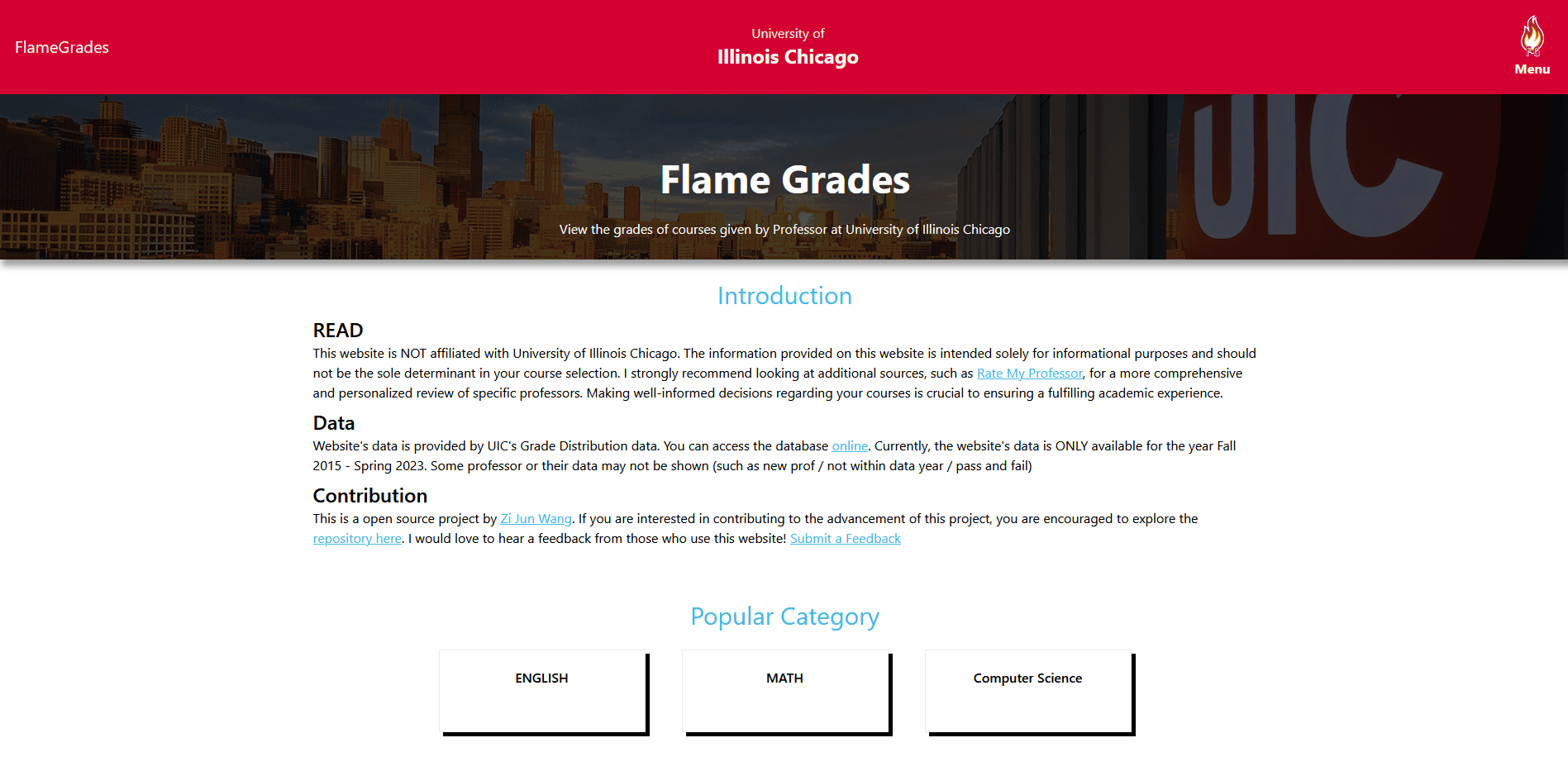 FlameGrade enables students to effortlessly explore and evaluate professors, access detailed insights into general education and major-specific classes, and make informed decisions based on comprehensive class statistics, including average GPAs and grade distributions.
